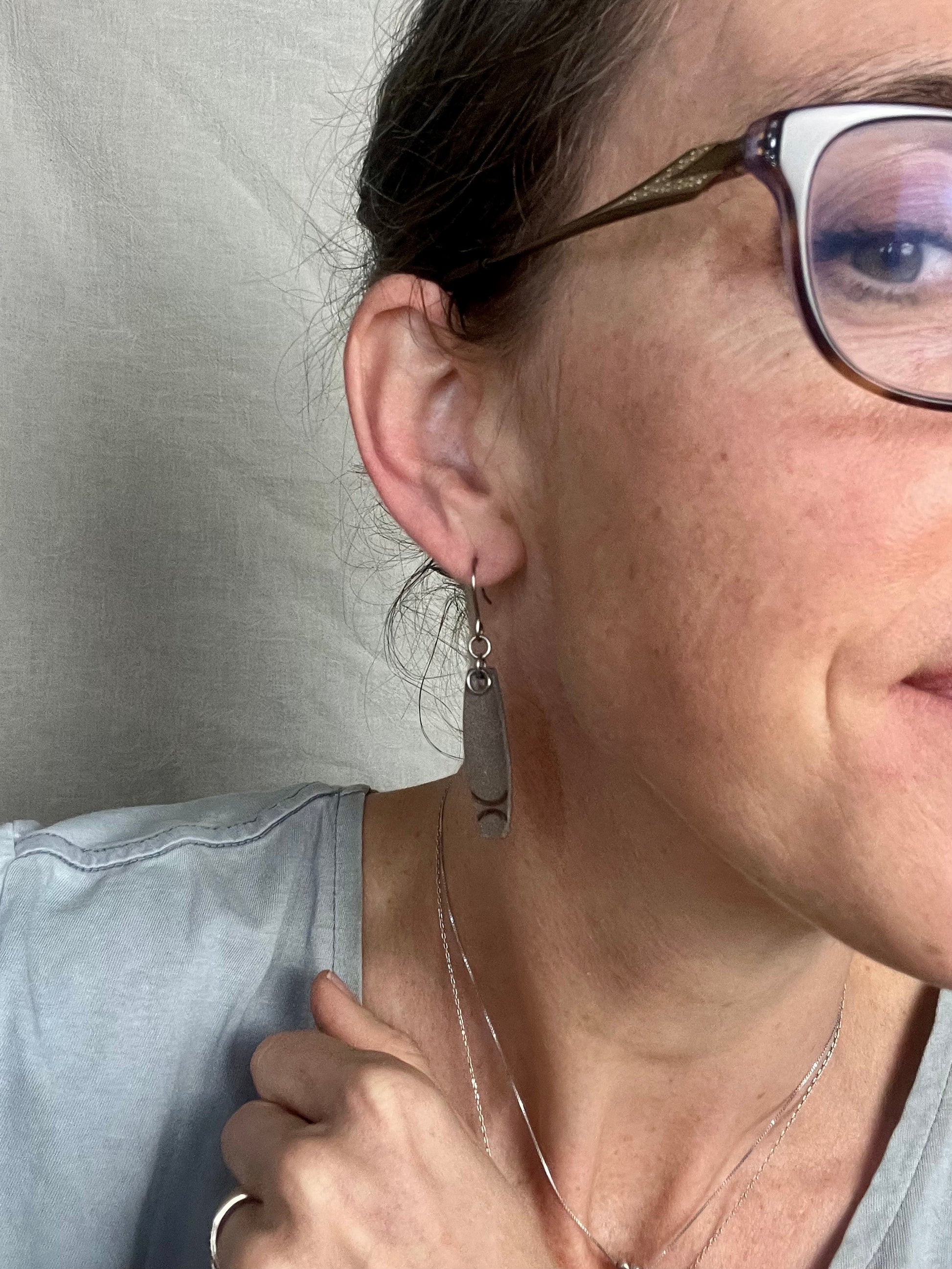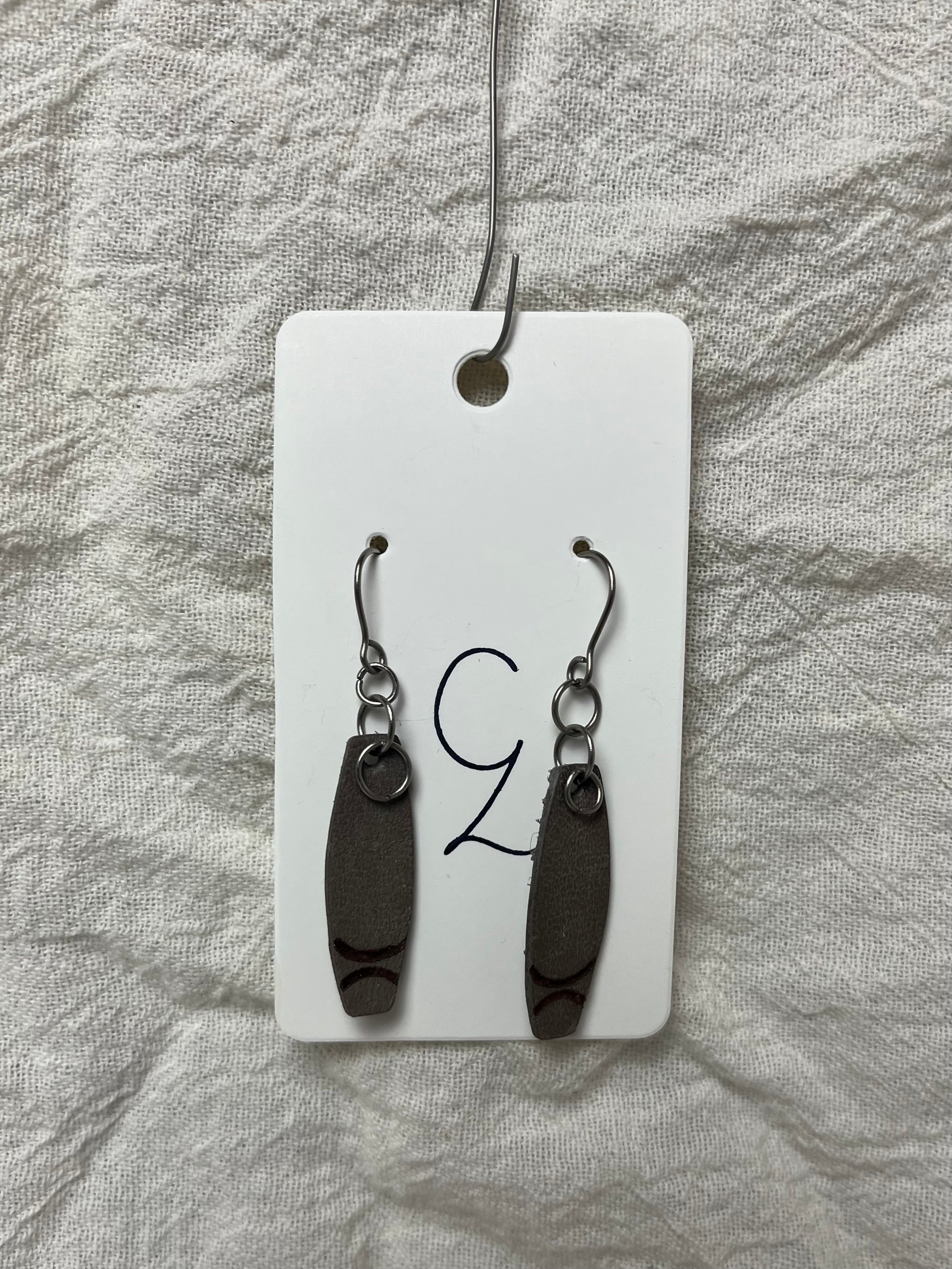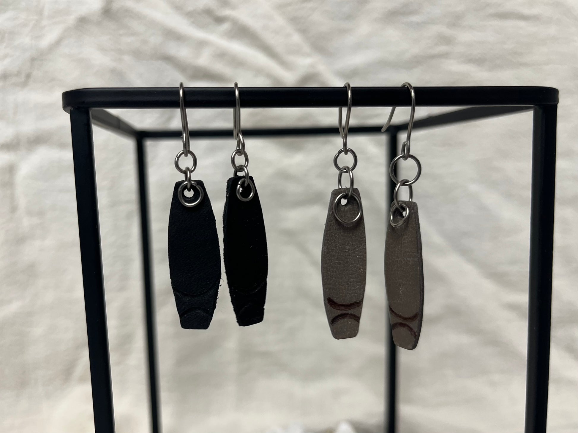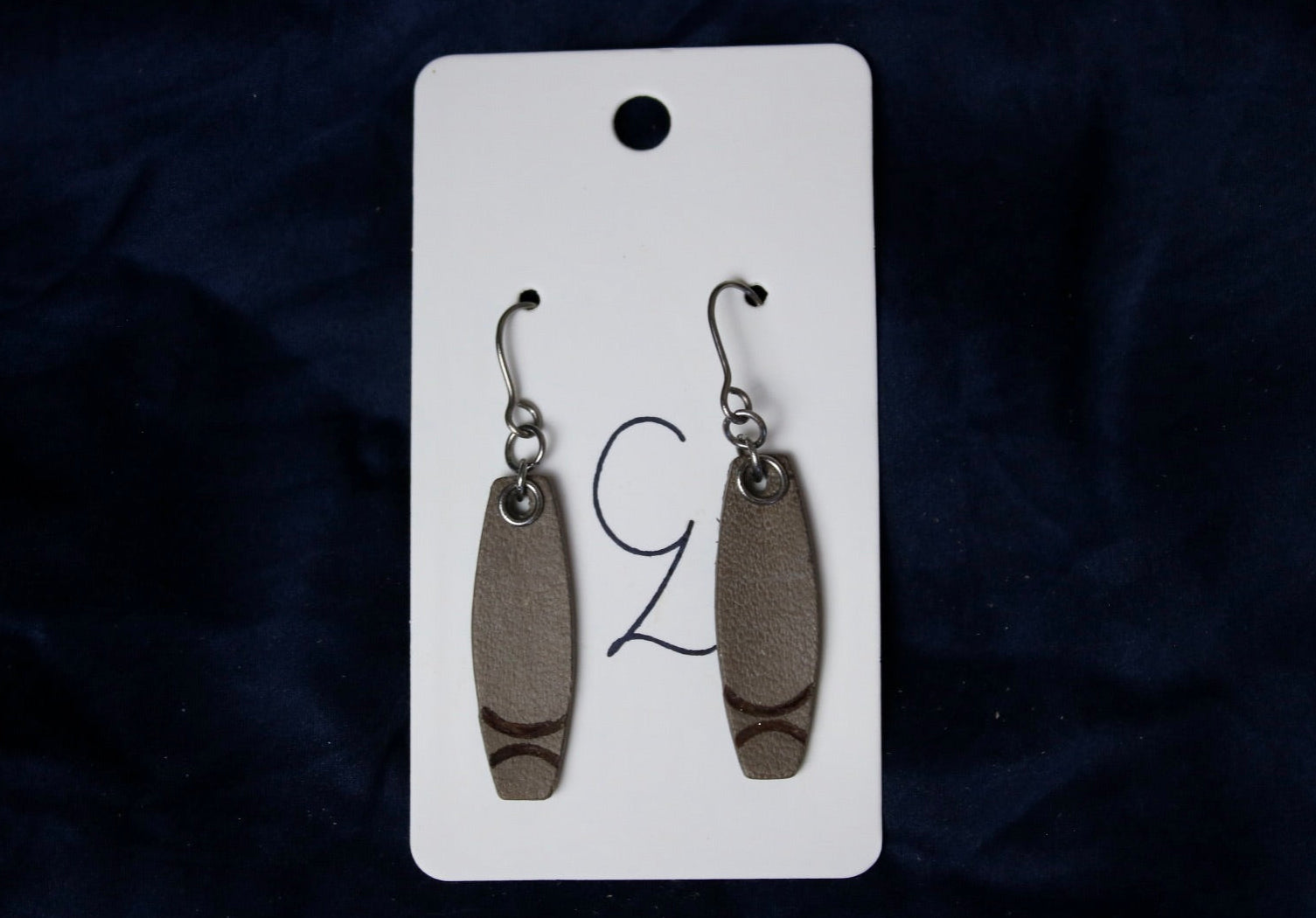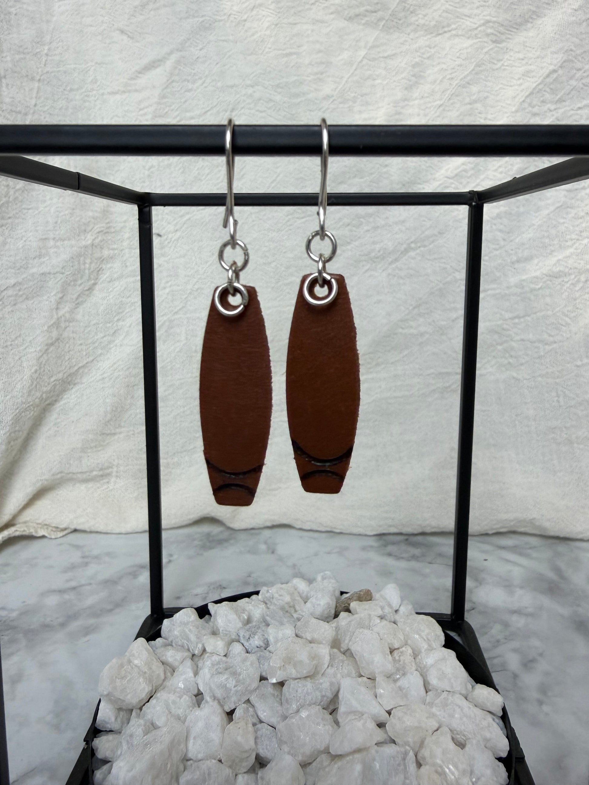 Our leather earrings are light weight, non-toxic, and metal allergy friendly. We provide a way to enjoy leather in a classy way. Designs are burned into the leather using pyrography. Made of high quality vachetta Italian full grain leather. Our Products are hand dyed with natural non-toxic processes for dying, as well as, conditioned and waxed. You have two options for metal: sterling silver and titanium.