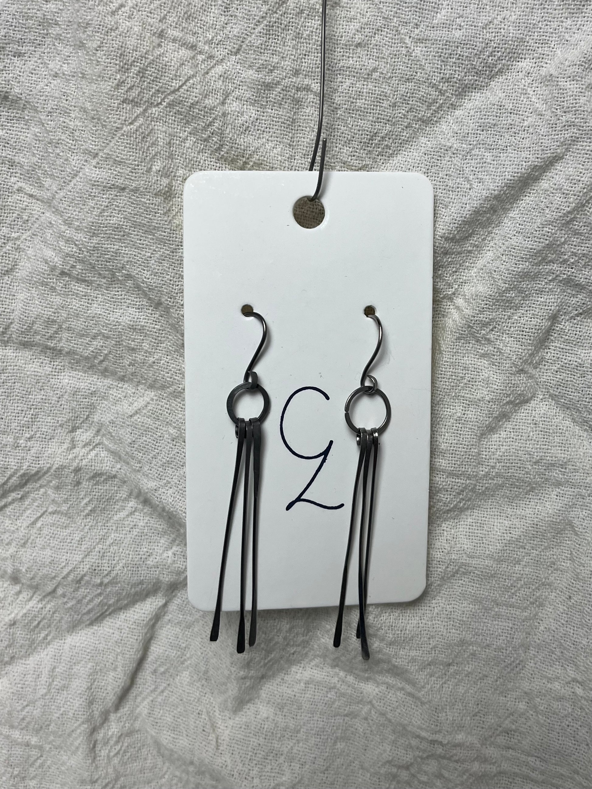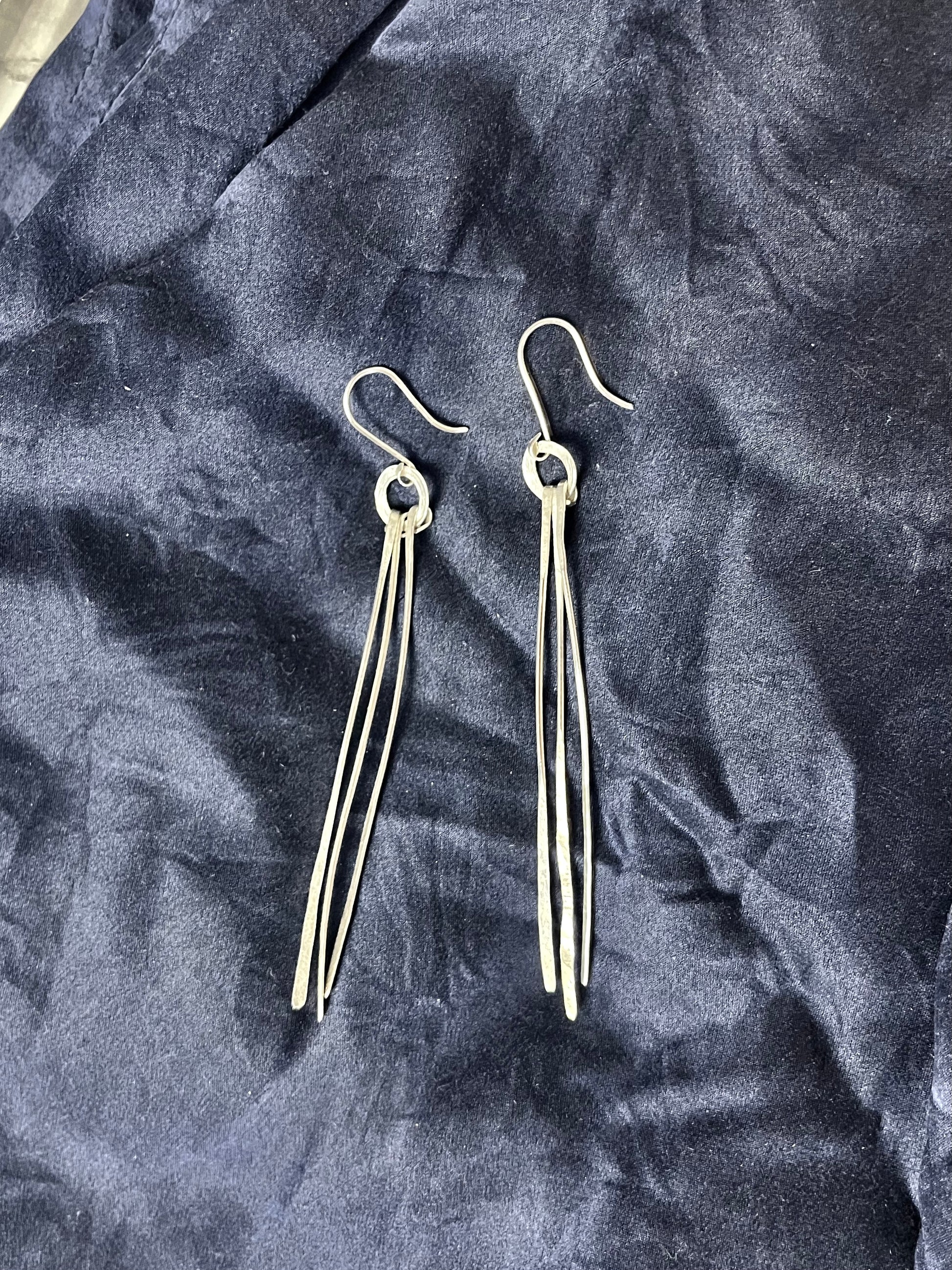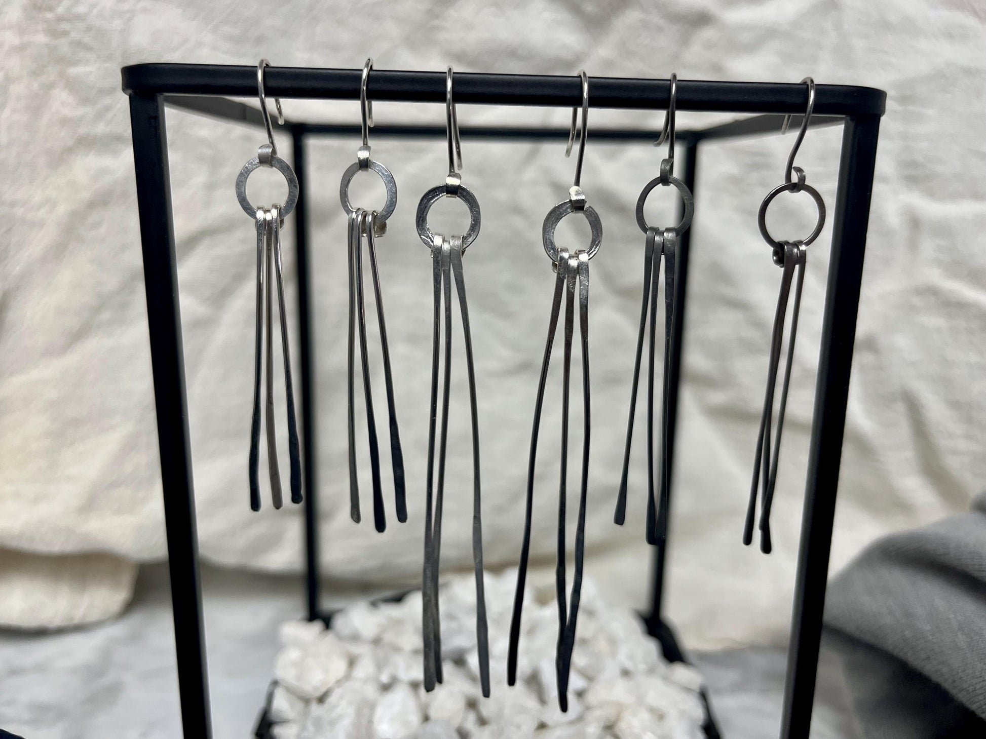These sterling silver or titanium dangling earrings have three hammered wires hanging down from a hammered circle. there are two sizes:the larger version of the trinity with a length of 4.5 inches and original 3 inches long. Ear wires are 20 gage.