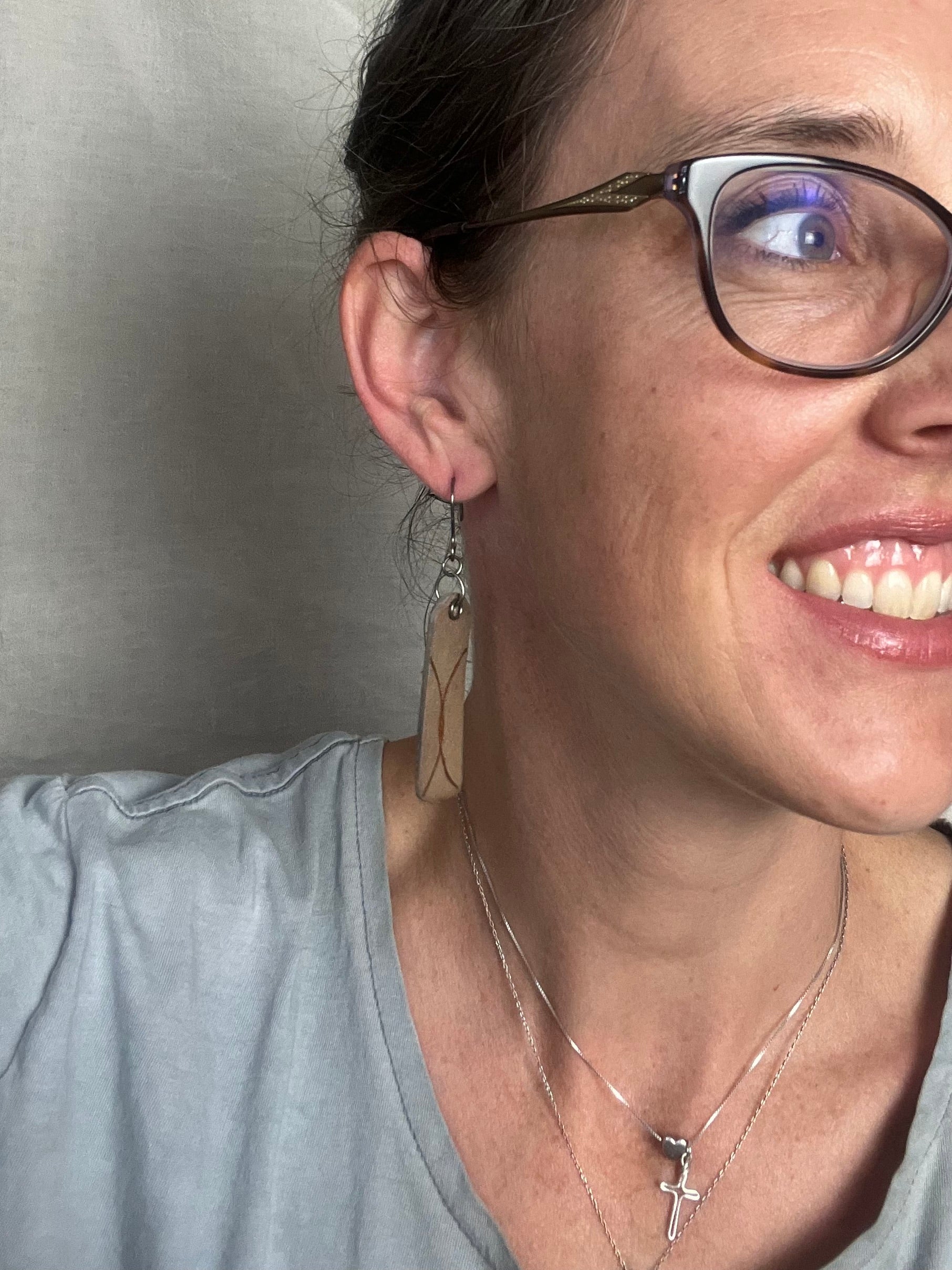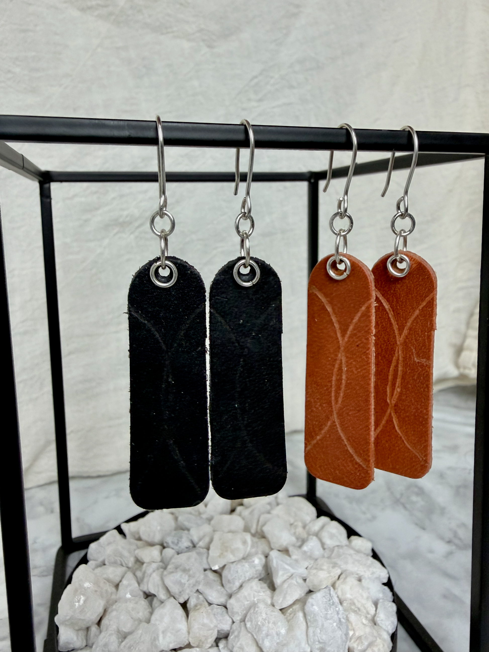 Our leather earrings are light weight, non-toxic, and metal allergy friendly. We provide a way to enjoy leather in a classy way. Designs are burned into the leather using pyrography. Made of high quality vachetta Italian full grain leather. Our Products are hand dyed with natural non-toxic processes for dying, as well as, conditioned and waxed. You have two options for metal: sterling silver and titanium.